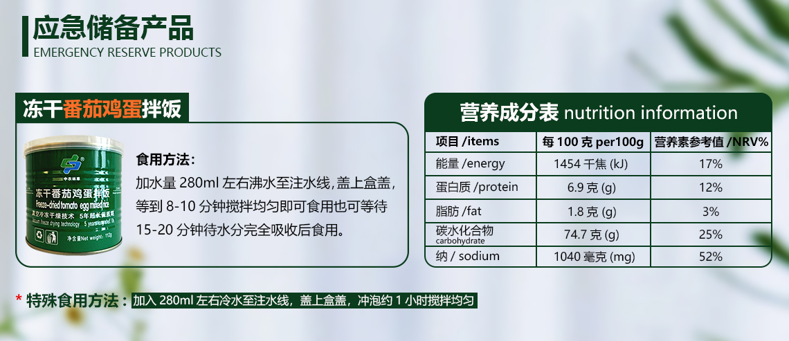 中农林草冻干食品系列,重量轻,食用方便,口味丰富,罐装易储藏。保质期5年以上不变质;能量高,营养均衡;任何情况下,无论是冷水、热水冲泡食用还是直接食用都可以,是应急使用、战略储备物资的最佳选择之一。 产品应用 1.全国应急管理储备部门:应对突发的自然灾害、灾难;应对突发假想战争的战略应对的地方储备,保障确保关键时刻应急物资能够拿得出、调得快、用得上; 2.边防部队:应对困难地区、物资缺乏区域等恶劣条件下的物资供应保 障使用; 3.家庭应急:家庭应对自然灾害与非自然灾害的保障产品包